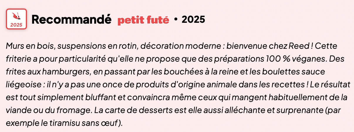 Pensez à réserver votre table, surtout le week-end, pour profiter pleinement de l’expérience Reed dans un cadre chaleureux et accueillant.